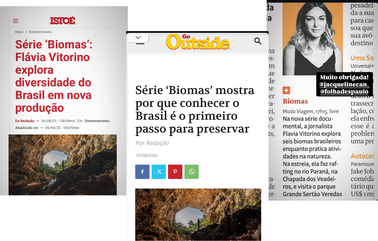 Uma produção audiovisual em seis episódios que percorre os biomas do país. Exibida no Globoplay, Canal OFF e Modo Viagem, a série combina jornalismo, arte e natureza para revelar um Brasil profundo onde sustentabilidade, cultura e vida selvagem se entrelaçam.