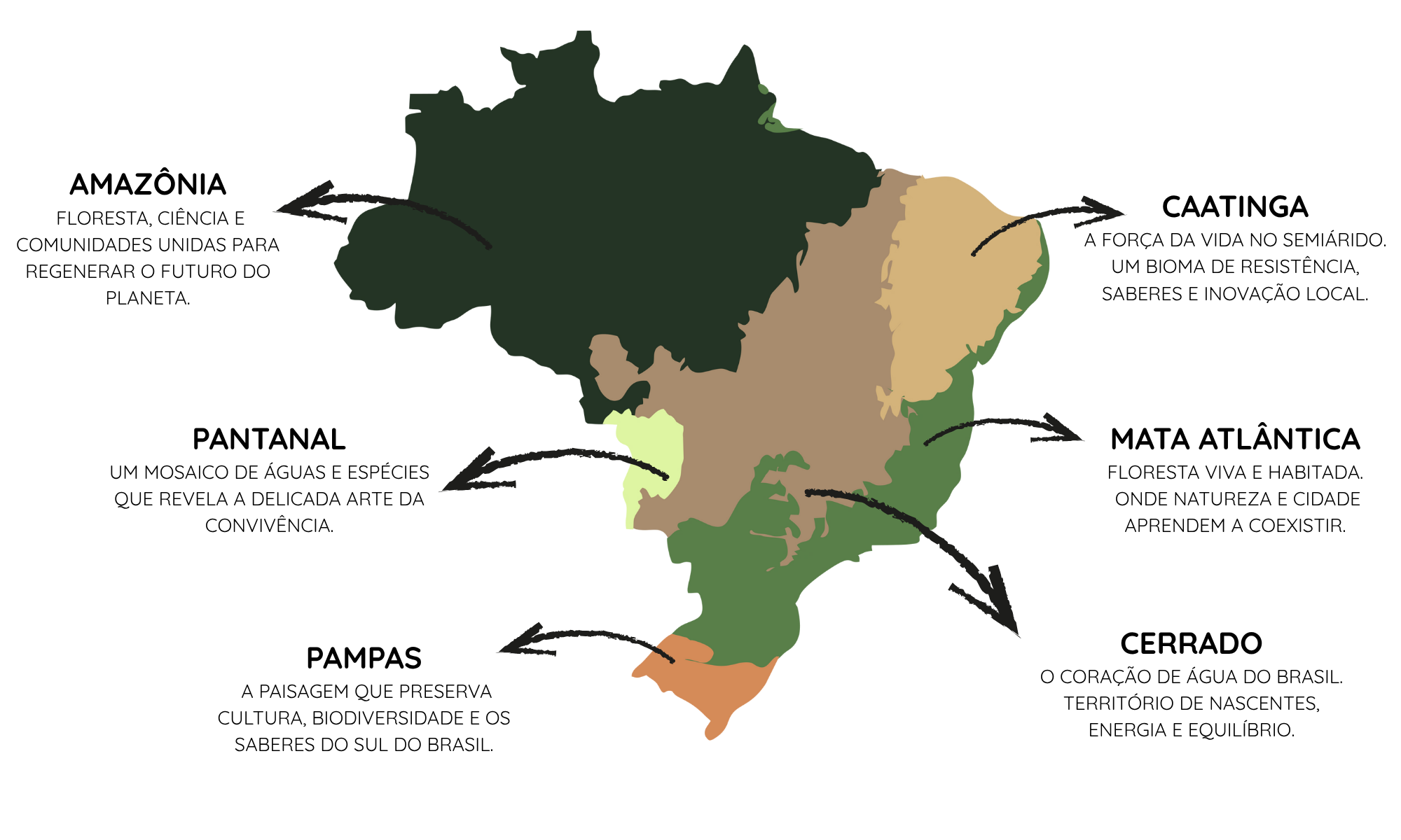 Biomas retratados: Amazônia, Cerrado, Caatinga, Mata Atlântica, Pantanal e Pampas.